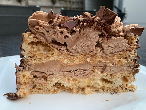 Bodem en deksel van zelfgemaakte meringue (eiwitschuim) met chocolade slagroom ertussen. De zijkant is afgestreken met chocoladeslagroom en aangezet met pure chocoladesnippers. Wordt standaard uit de diepvries geleverd en is ideaal om als dessert te serveren. Smaakt het beste als hij nog een heel klein beetje bevroren is. Er is ook een lactose-arme versie van de Christoffel.