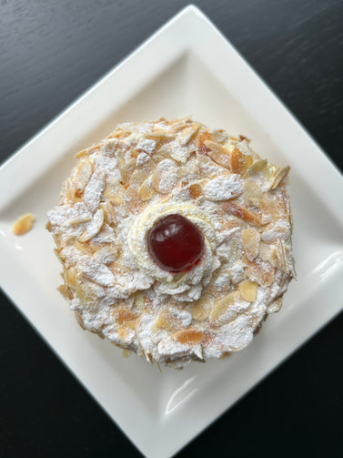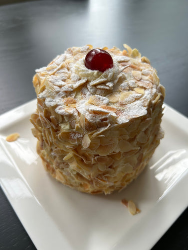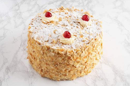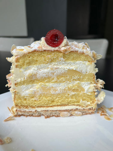 Macaronbodem met crème au beurre. Hierop een luchtige biscuit, besprenkeld met likeur, crème patissier en slagroom. De taart is aan de boven- en zijkant afgestreken met crème au beurre en eigen geroosterde amandelsnippers.