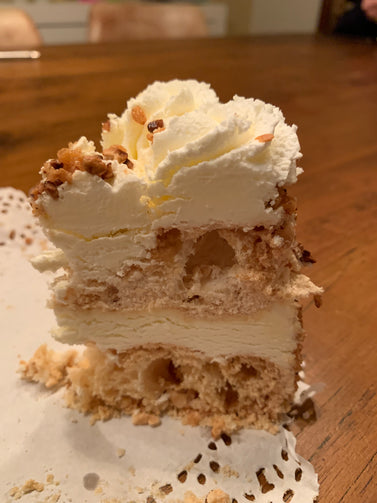 Bodem en deksel van zelfgemaakte meringue (eiwitschuim) met slagroom ertussen. De zijkant is afgestreken met slagroom en aangezet met hazelnootkrokant. Wordt standaard uit de diepvries geleverd en is ideaal om als dessert te serveren. Smaakt het beste als hij nog een heel klein beetje bevroren is.