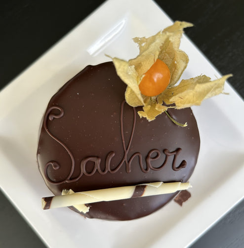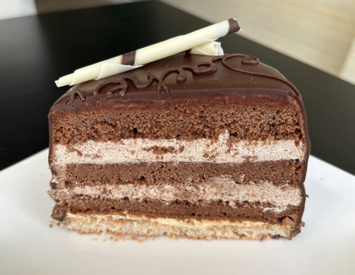 Macaronbodem met daarop een luchtige chocoladebiscuit. Hierop chocoladeslagroom en een beetje zelfgemaakte frambozenconfituur. De zijkant en bovenkant zijn ook met chocolade slagroom aangestreken. De hele gateau is overgoten met grenache en gegarneerd met Physalis.