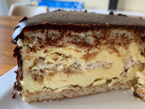 Bodem van macarondeeg. Als onderlaag crème au beurre met hierop zelfgemaakte meringue (eiwitschuim) en als top wederom crème au beurre. De bovenkant is een deksel van macarondeeg. Rondom afgewerkt met crème au beurre, pure chocolade snippers (vanille) of melkchocolade (mokka) snippers en bovenop een laagje grenache.